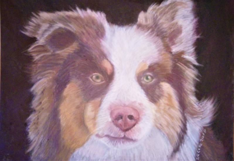 Australian Sheperds hebben van zichzelf al een geweldige uitstraling met hun veelal mooie expressieve hoofd. Daarom zijn ze ook een dankbaar onderwerp om te tekenen. Naast het fokken van deze mooie hondjes teken ik ook en bestaat dus ook de mogelijkheid om je lieveling te laten portreteren. Uiteraard als je geen Aussie bent kun je je baasje vragen om zo'n mooi portret. Prijzen vanaf 85 euro afhankelijk van het formaat en de gebruikte materialen. Voor meer informatie neem contact op.